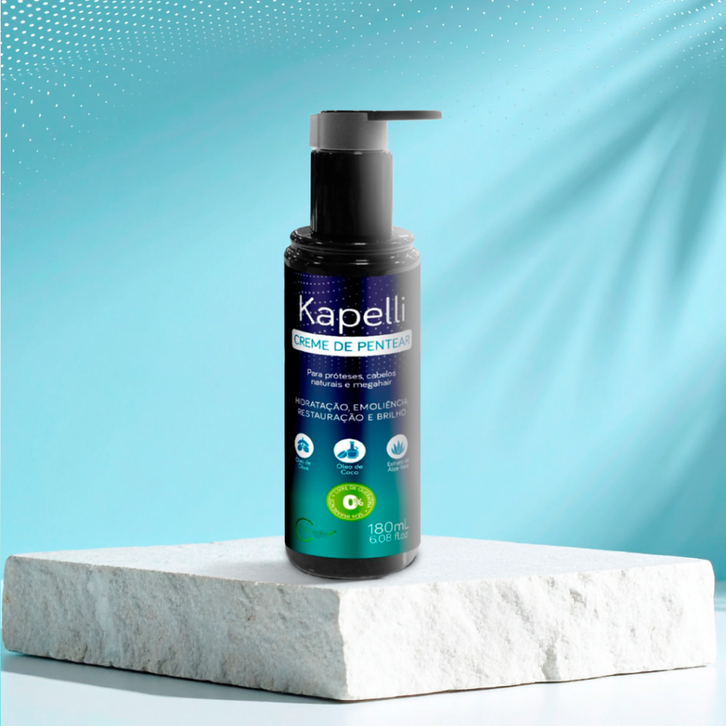 O creme de pentear Kapelli possui ação altamente hidratante. Facilitando o desembaraço total dos fios. Sua fórmula possui Óleo de coco, Óleo de Oliva. Pentanol e extrato de Aloe Vera que promovem maciez, reparação, brilho e diminuição do frizz da raiz as pontas, sem deixar os cabelos pesados. grande poder de umectação emôliencia incorporado para a fibra capilar. Auxilia na hidratação profunda dos fios.